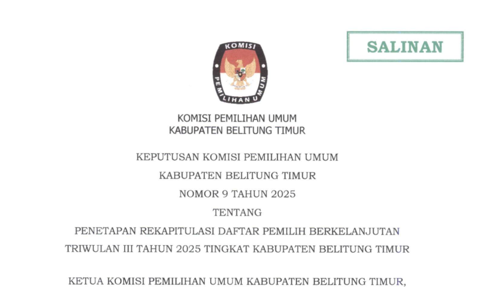 Berikut kami sampaikan Berita Acara Nomor : 20/TIK.04-BA/1906/2025 Tentang Rekapitulasi Daftar Pemilih Berkelanjutan Triwulan III Tahun 2025, serta; Keputusan KPU Kabupaten Belitung Timur Nomor 9 Tahun 2025 Tentang Penetapan Rekapitulasi Daftar Pemilih Berkelanjutan Triwulan III Tahun 2025 Tingkat Kabupaten Belitung Timur. Masyarakat Kabupaten Belitung Timur juga bisa memberikan masukan tanggapan terkait hasil Rekapitulasi Daftar Pemilih Berkelanjutan Triwulan III Tahun 2025 tersebut. Selengkapnya dapat diunduh pada link dibawah ini: Berita Acara PDPB Triwulan III Tahun 2025 SK Penetapan PDPB Triwulan III Tahun 2025 Form Model A-Tanggapan Masyrakat-PDPB ....