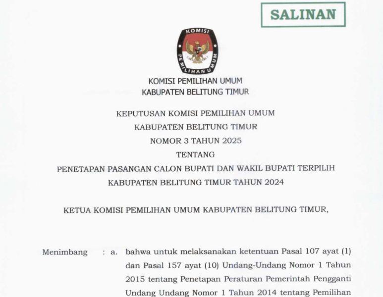 Keputusan KPU Kabupaten Belitung Timur Nomor 3 Tahun 2025 tentang Penetapan Pasangan Calon Bupati dan Wakil Bupati Terpilih Kabupaten Belitung Timur Tahun 2024