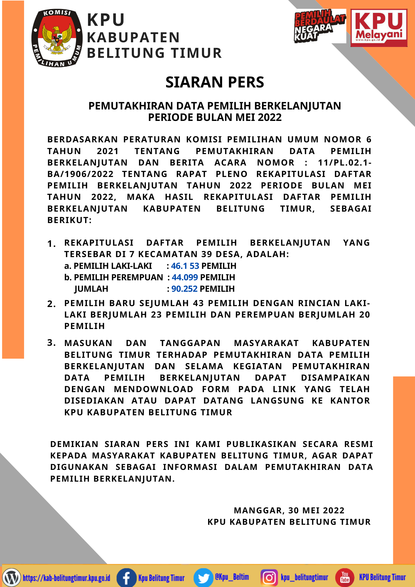 Rapat Pleno yang dilaksanakan KPU Kabupaten Belitung Timur menghasilkan hal sebagai berikut : Rekapitulasi Daftar Pemilih Berkelanjutan Periode bulan Mei Tahun 2022 dengan jumlah sebanyak 90.252 (sembilan puluh ribu dua ratus lima puluh dua) pemilih dengan rincian pemilih laki-laki berjumlah 46.153 (empat puluh enam ribu seratus lima puluh tiga) pemilih dan pemilih perempuan berjumlah 44.099 (empat puluh empat ribu sembilan puluh sembilan) pemilih, tersebar di 7 kecamatan.