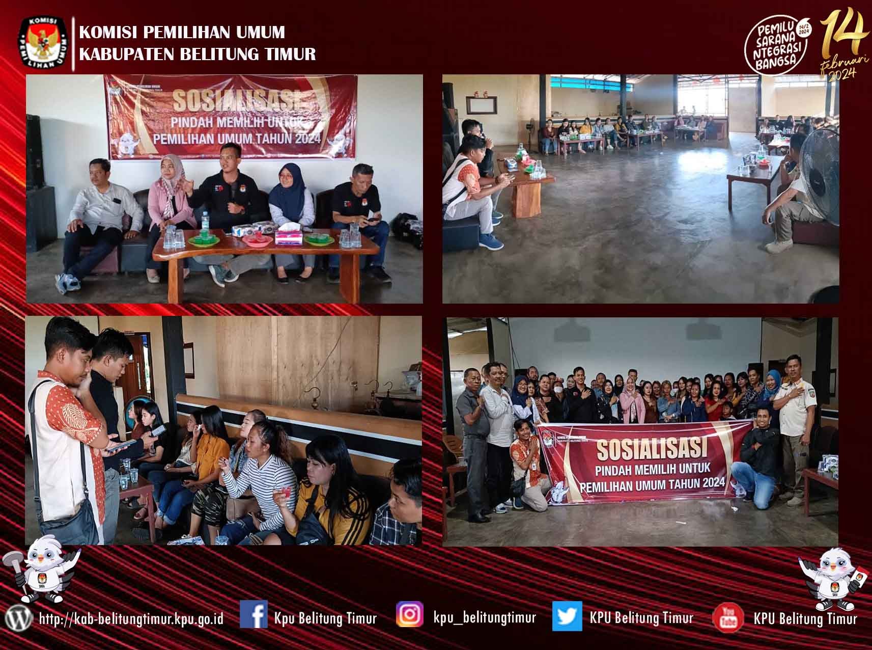 Manggar - Ketua KPU Kabupaten Belitung Timur, Marwansyah beserta Anggota, Muhammad Tahir, Asrikhah, Iskandar dan Leny Septriani melaksanakan Sosialisasi Pindah Memilih pada penyelenggaraan Pemilihan Umum Tahun 2024 di Warung/cafe daerah Mirang Desa Padang Kecamatan Manggar, Kamis (26/10/2023).