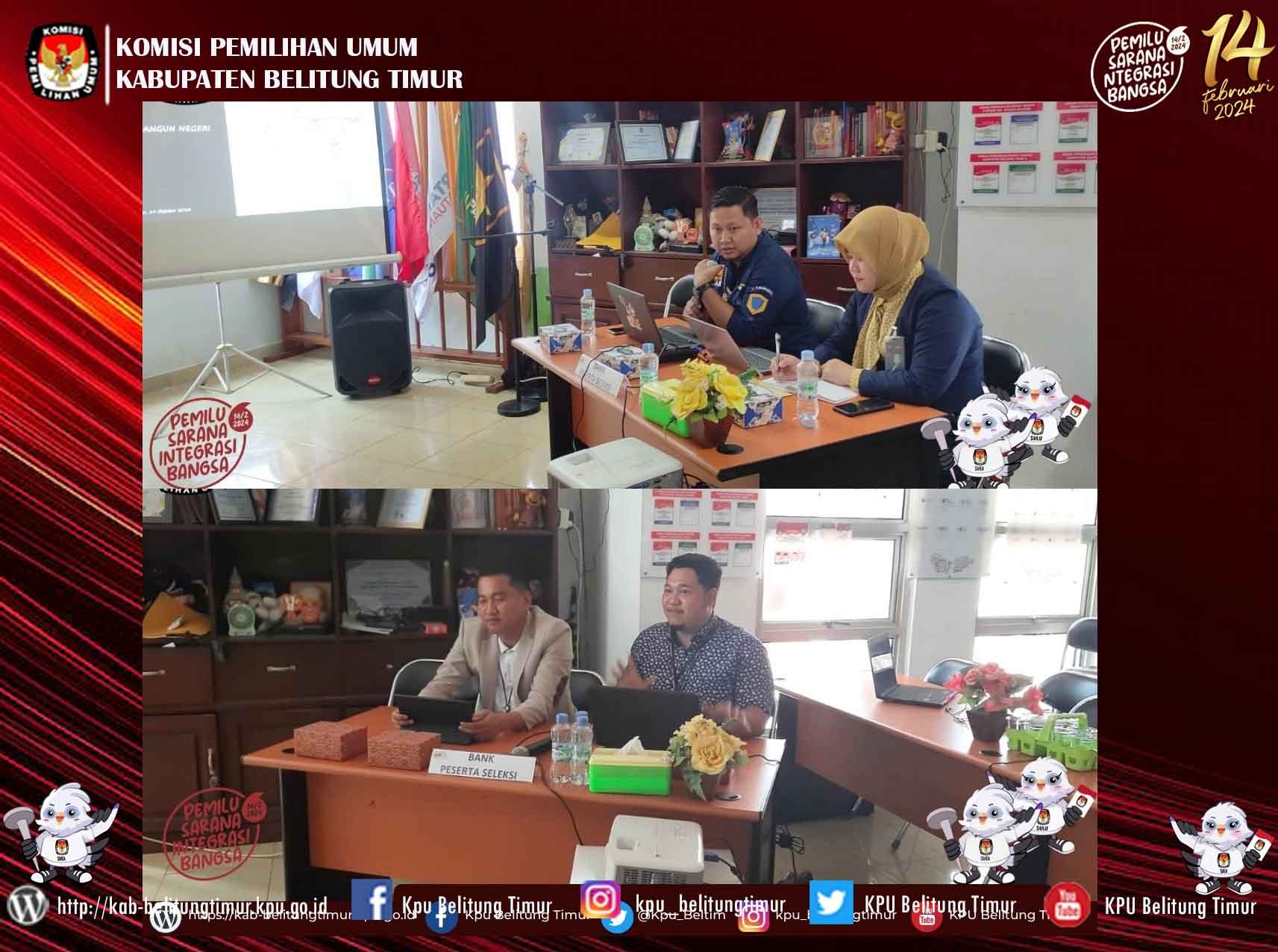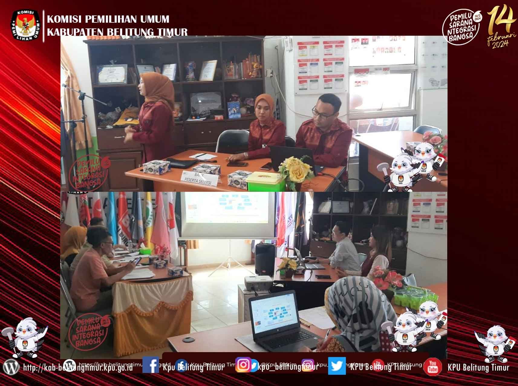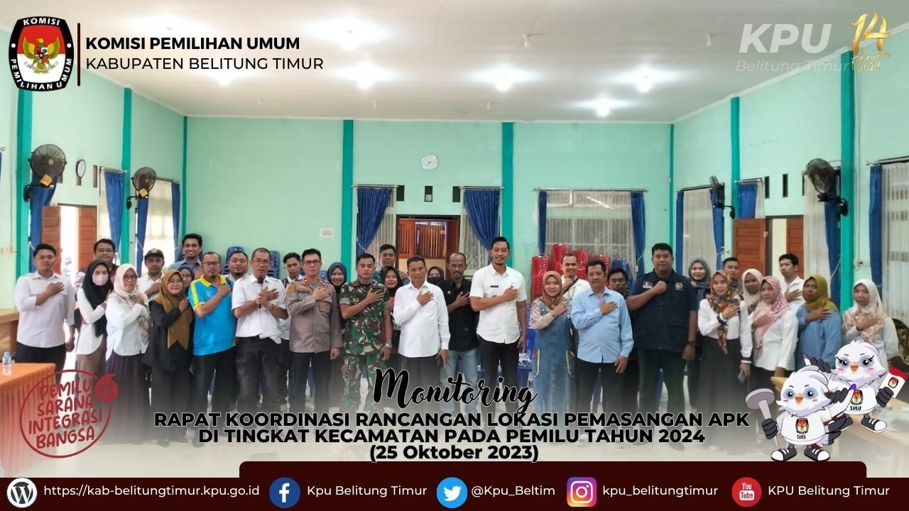 Manggar - Anggota KPU Kabupaten Belitung Timur, Iskandar dan Leny Septriani melakukan monitoring kegiatan Rapat Koordinasi Rancangan Lokasi Pemasangan Alat Peraga Kampanye (APK) di tingkat Kecamatan pada Pemilu Tahun 2024 di Kecamatan Manggar, Rabu (25/10/2023).