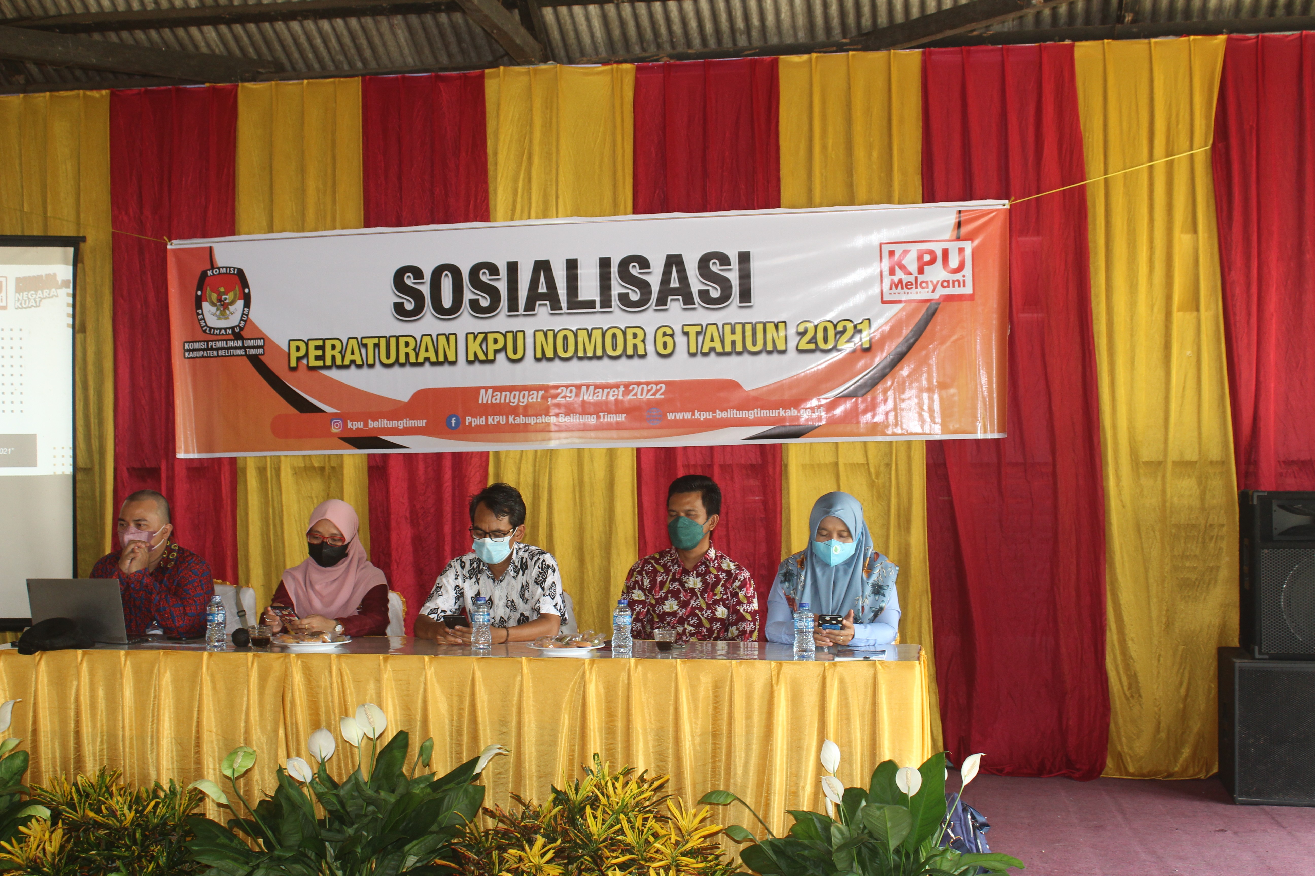 Manggar, Komisi Pemilihan Umum (KPU) Kabupaten Belitung Timur melaksanakan Sosialisasi Peraturan Komisi Pemilihan Umum Nomor 6 Tahun 2021, Selasa (29/03).