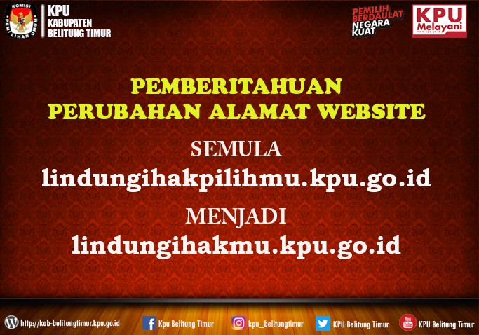 Pemberitahuan Perubahan Alamat Website Jumat, 24 Desember 2021 00:00 396 Pemberitahuan kepada seluruh pemilih bahwa website lindungihakpilihmu.kpu.go.id telah berubah alamat menjadi https://lindungihakmu.kpu.go.id Baca Selengkapnya