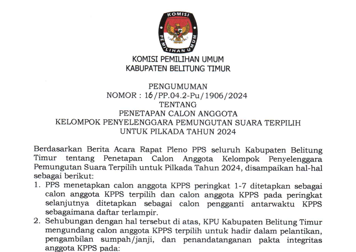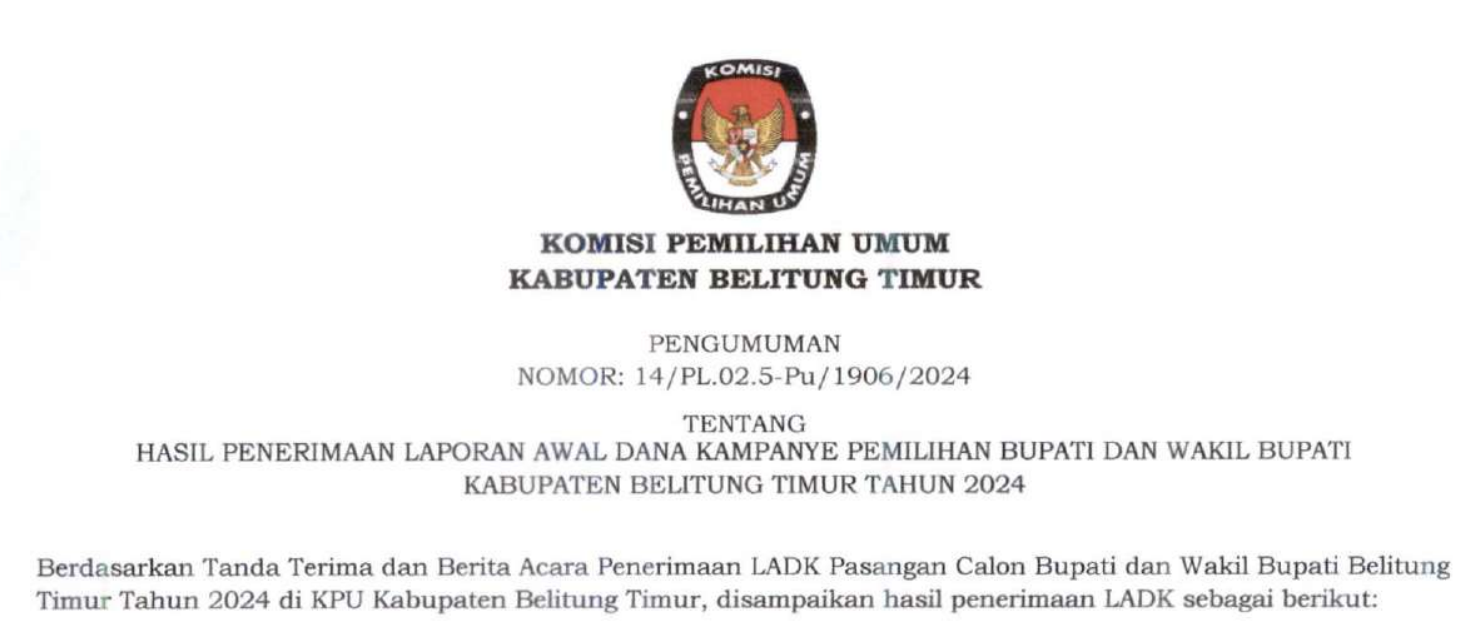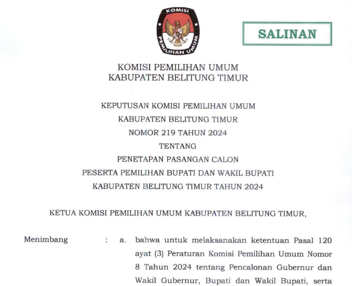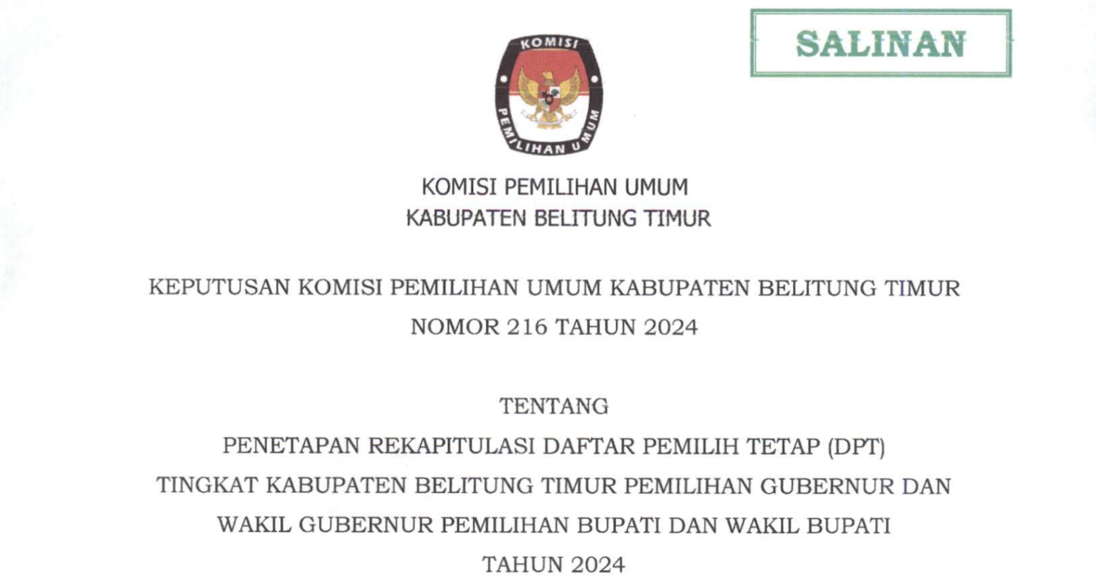 Manggar, kab-belitungtimur.kpu.go.id - Keputusan Komisi Pemilihan Umum Kabupaten Belitung Timur Nomor 216 Tahun 2024 Tentang Penetapan Rekapitulasi Daftar Pemilih Tetap (DPT) Tingkat Kabupaten Belitung Timur Pemilihan Gubernur dan Wakil Gubernur Pemilihan Bupati dan Wakil Bupati Tahun 2024