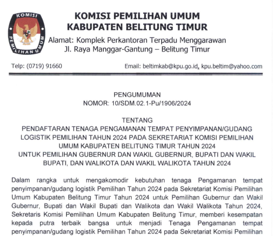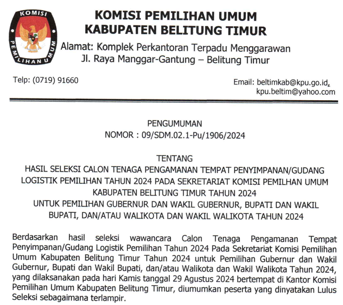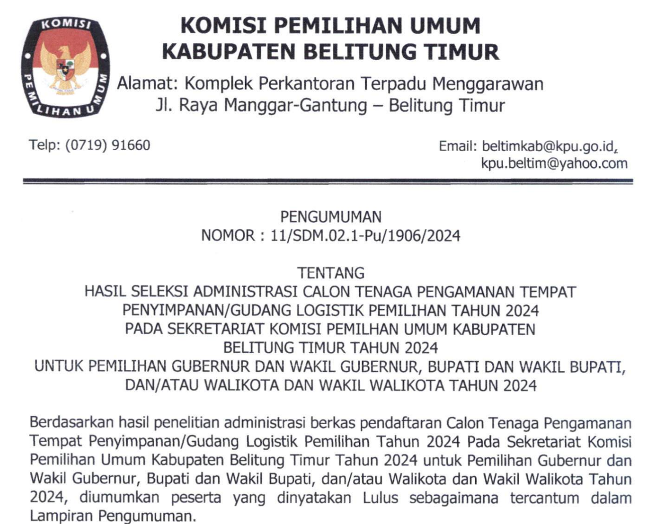 Manggar, kab-belitungtimur.kpu.go.id - Pengumuman Nomor 11/SDM.02.1-Pu/1906/2024 tentang Hasil Seleksi Administrasi Calon Tenaga Pengamanan Tempat Penyimpanan/Gudang Logistik Pemilihan Tahun 2024 Pada Sekretariat Komisi Pemilihan Umum Kabupaten Belitung Timur Tahun 2024 untuk Pemilihan Gubernur dan Wakil Gubernur, Bupati an Wakil Bupati, dan/atau Walikota dan Wakil Walikota tahun 2024.