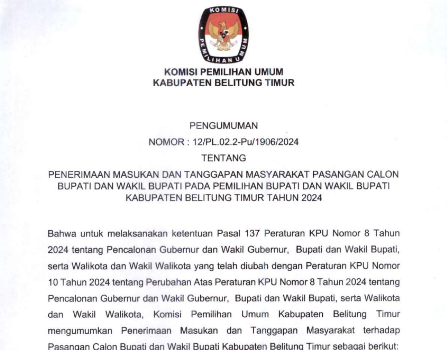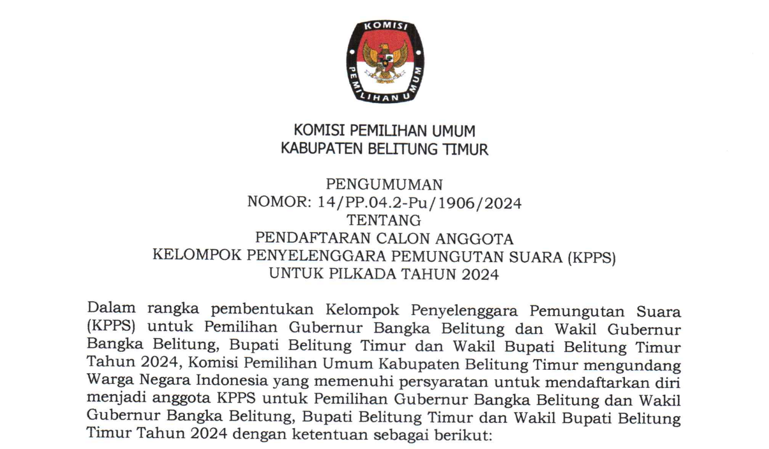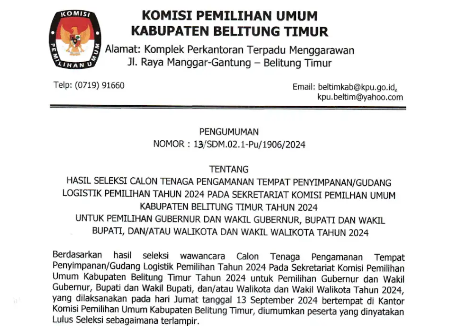 Manggar, kab-belitungtimur.kpu.go.id - Pengumuman Nomor 11/SDM.02.1-Pu/1906/2024 tentang Hasil Seleksi Administrasi Calon Tenaga Pengamanan Tempat Penyimpanan/Gudang Logistik Pemilihan Tahun 2024 Pada Sekretariat Komisi Pemilihan Umum Kabupaten Belitung Timur Tahun 2024 untuk Pemilihan Gubernur dan Wakil Gubernur, Bupati an Wakil Bupati, dan/atau Walikota dan Wakil Walikota tahun 2024.
