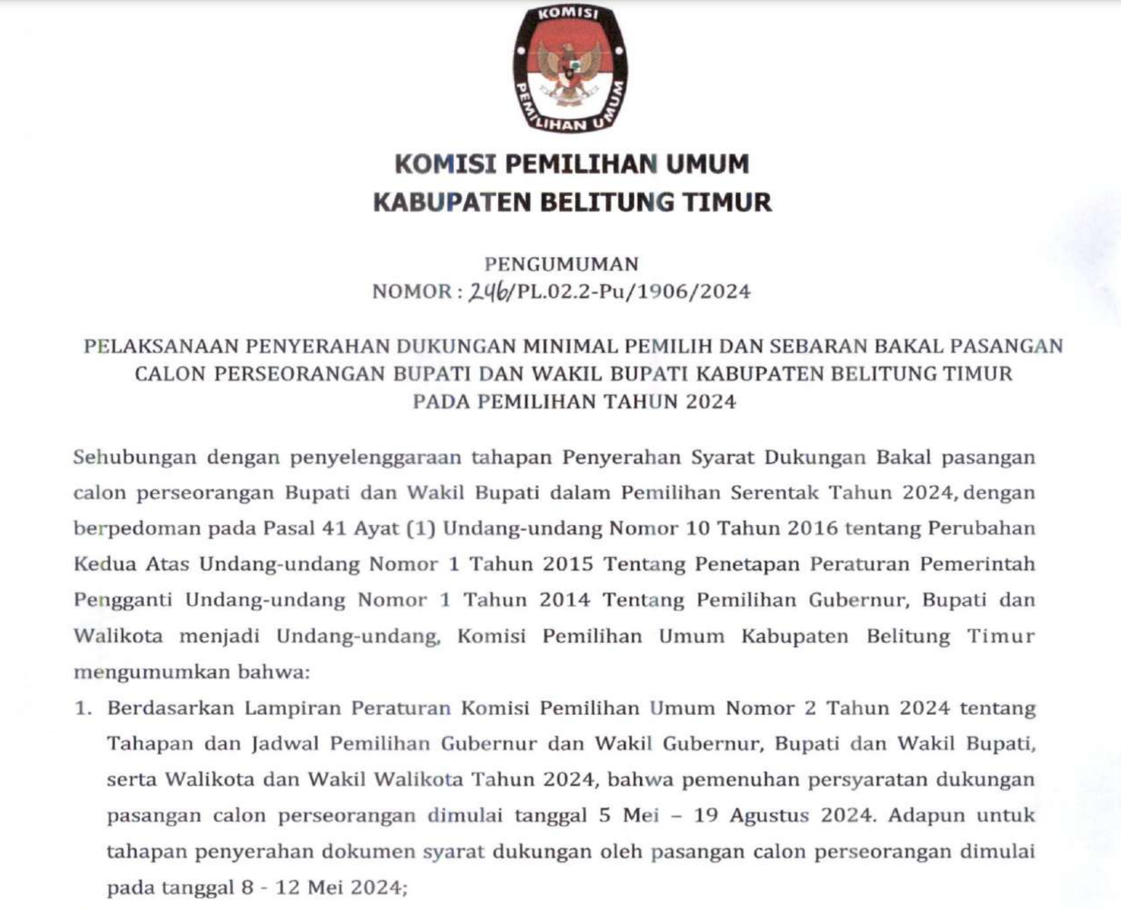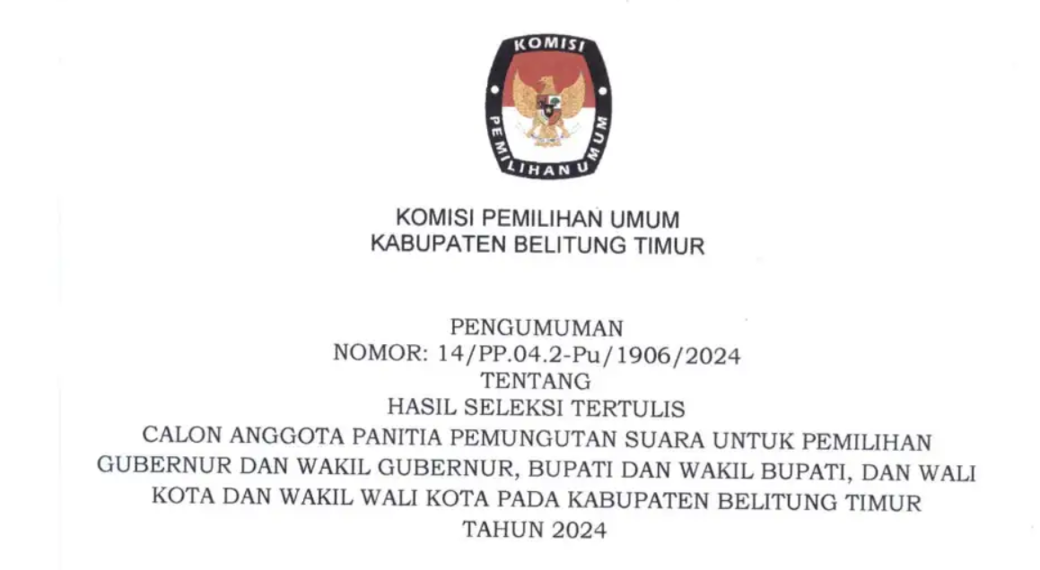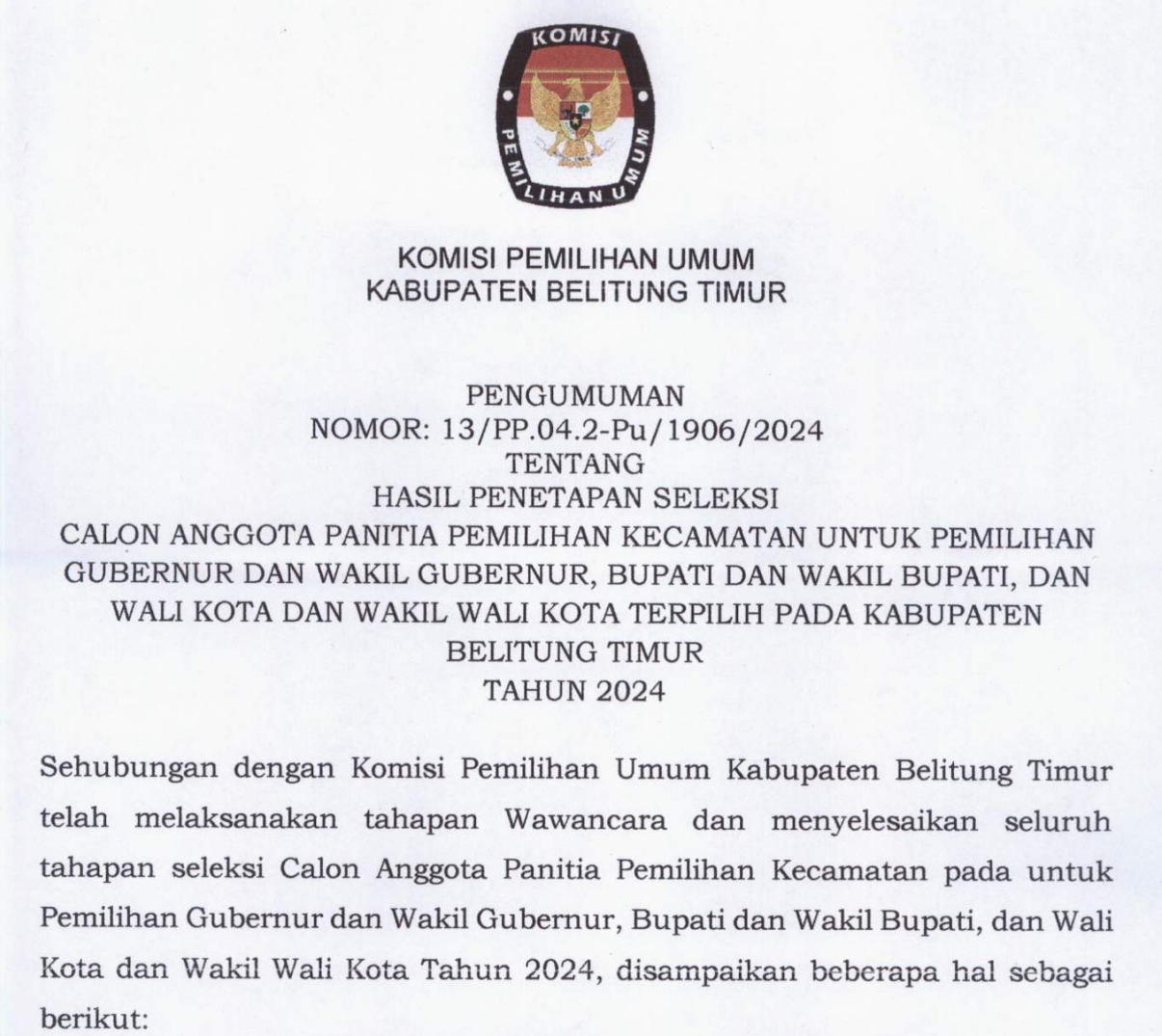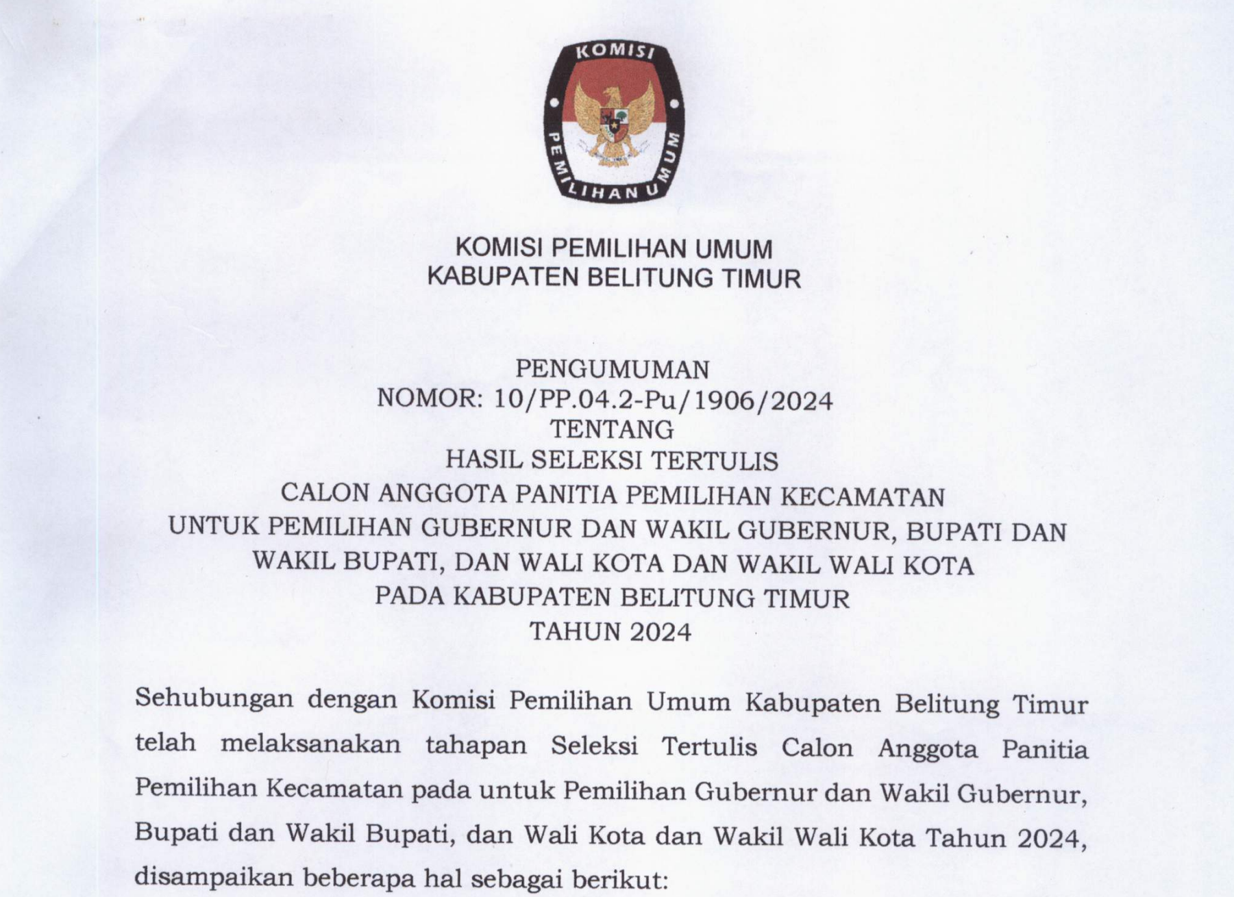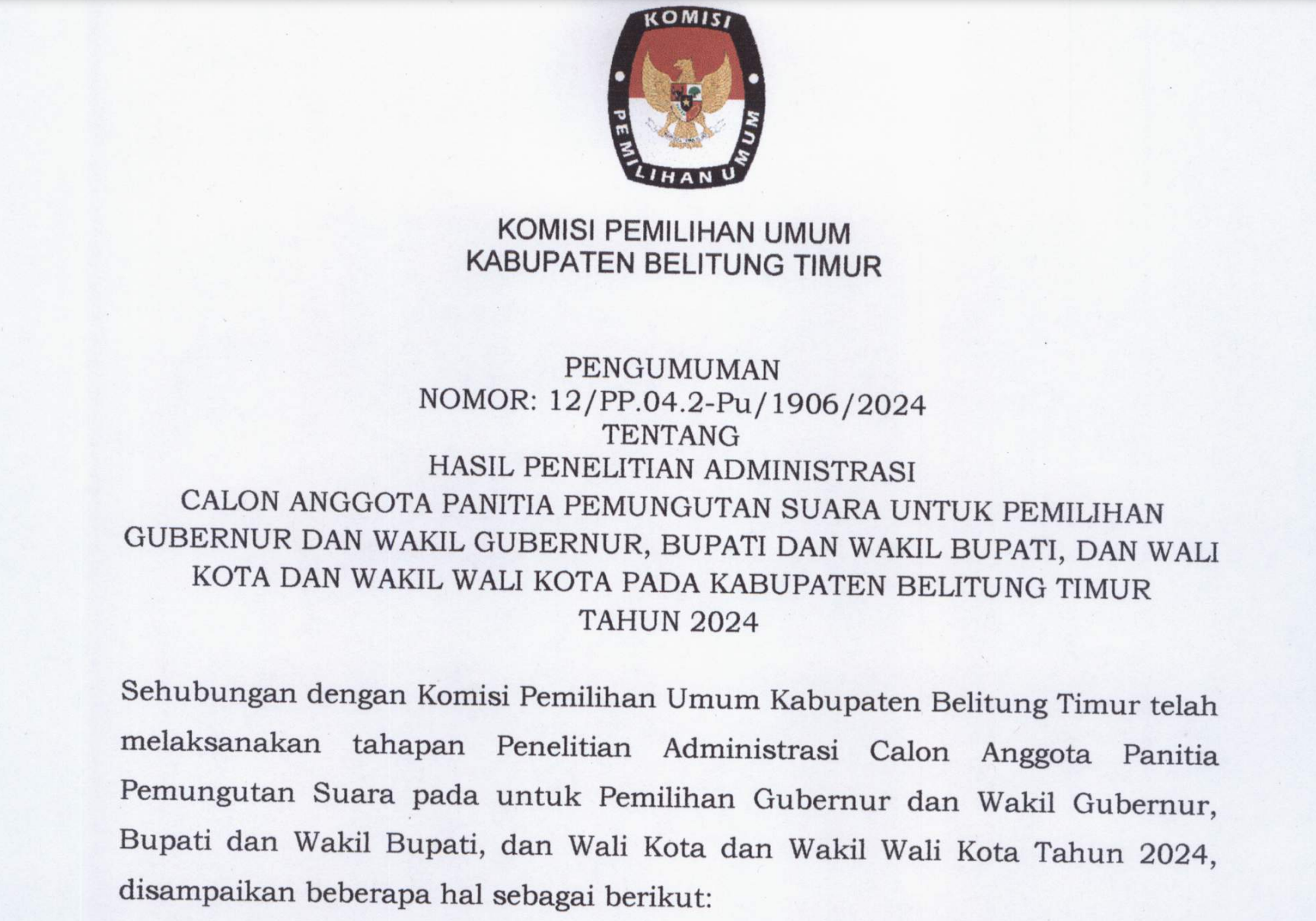 Manggar, kab-belitungtimur.kpu.go.id - Berikut kami sampaikan Pengumuman Nomor 11/PP.04.02-Pu/1906/2024 Tentang Perpanjangan Pendaftaran Seleksi Calon Anggota Panitia Pemungutan Suara untuk Pemilihan Gubernur dan Wakil Gubernur, Bupati dan Wakil Bupati, dan Wali Kota dan Wakil Wali Kota pada Kabupaten Belitung Timur Tahun 2024.