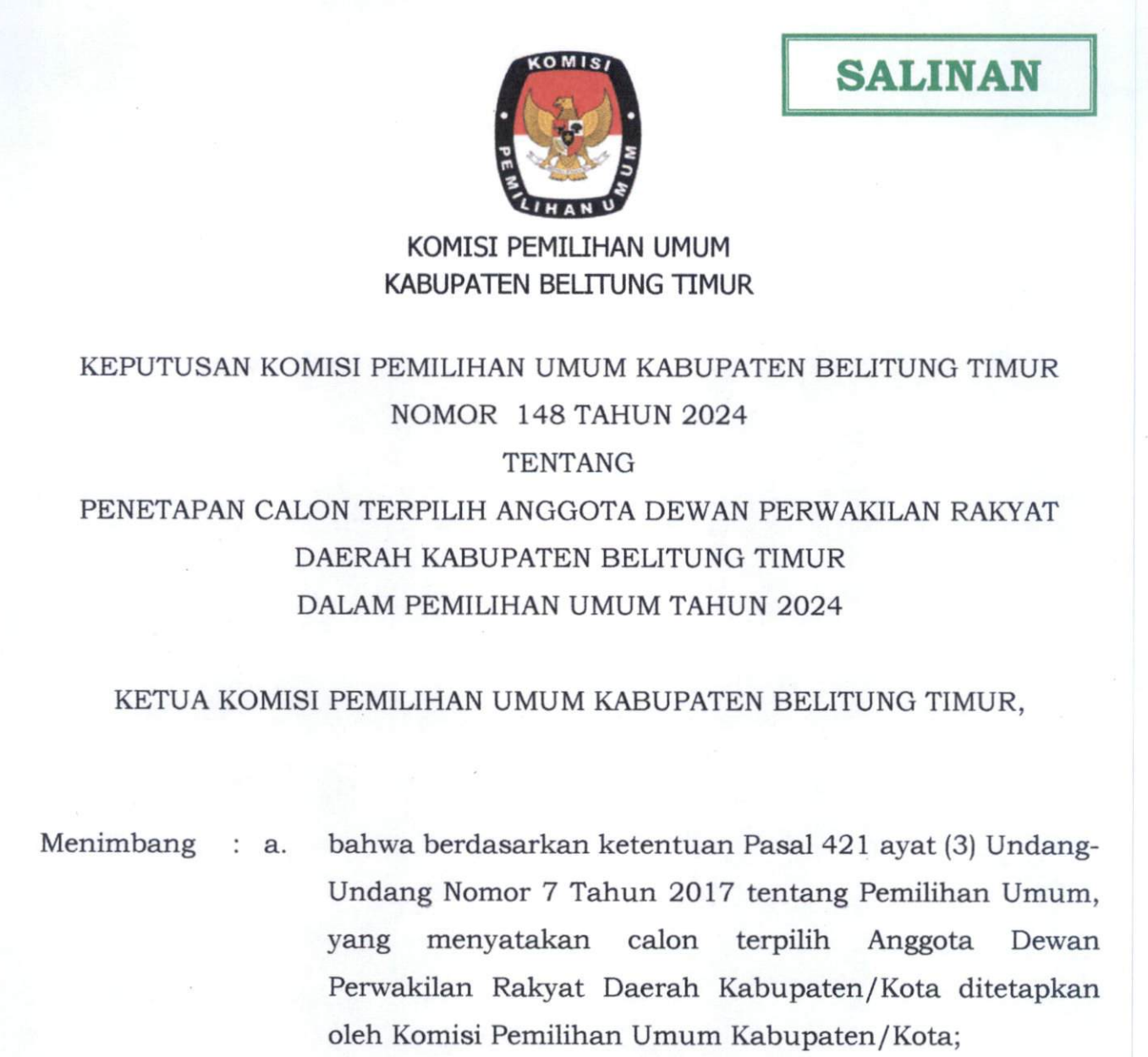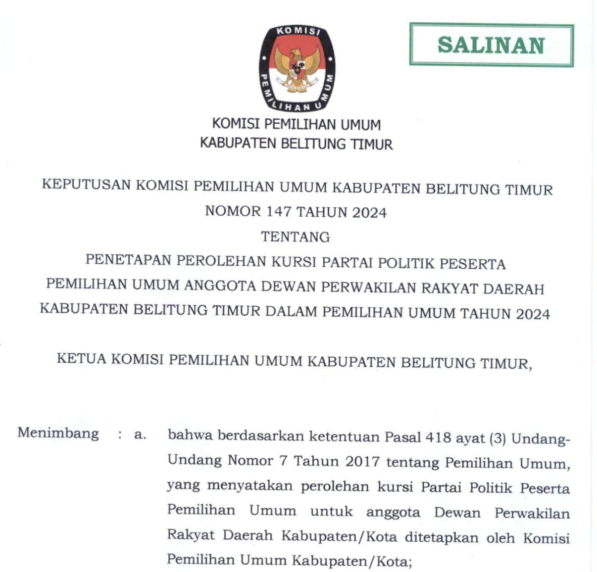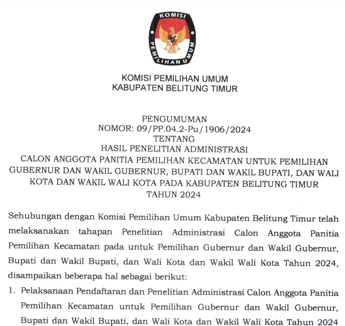 Manggar, kab-belitungtimur.kpu.go.id - Berikut kami sampaikan Pengumuman Nomor 07/PP.04.2-Pu/1906/2024 Tentang Perpanjangan Pendaftaran Seleksi Calon Anggota Panitia Pemilihan Kecamatan Untuk Pemilihan Gubernur dan Wakil Gubernur, Bupati dan Wakil Bupati, dan Wali Kota dan Wakil Wali Kota pada Kabupaten Belitung Timur Tahun 2024.
